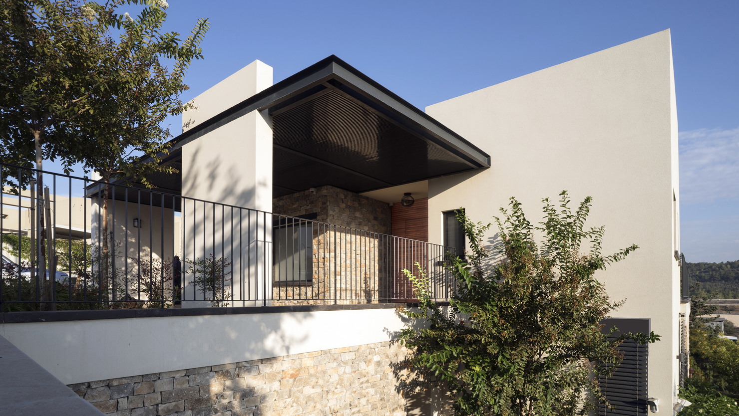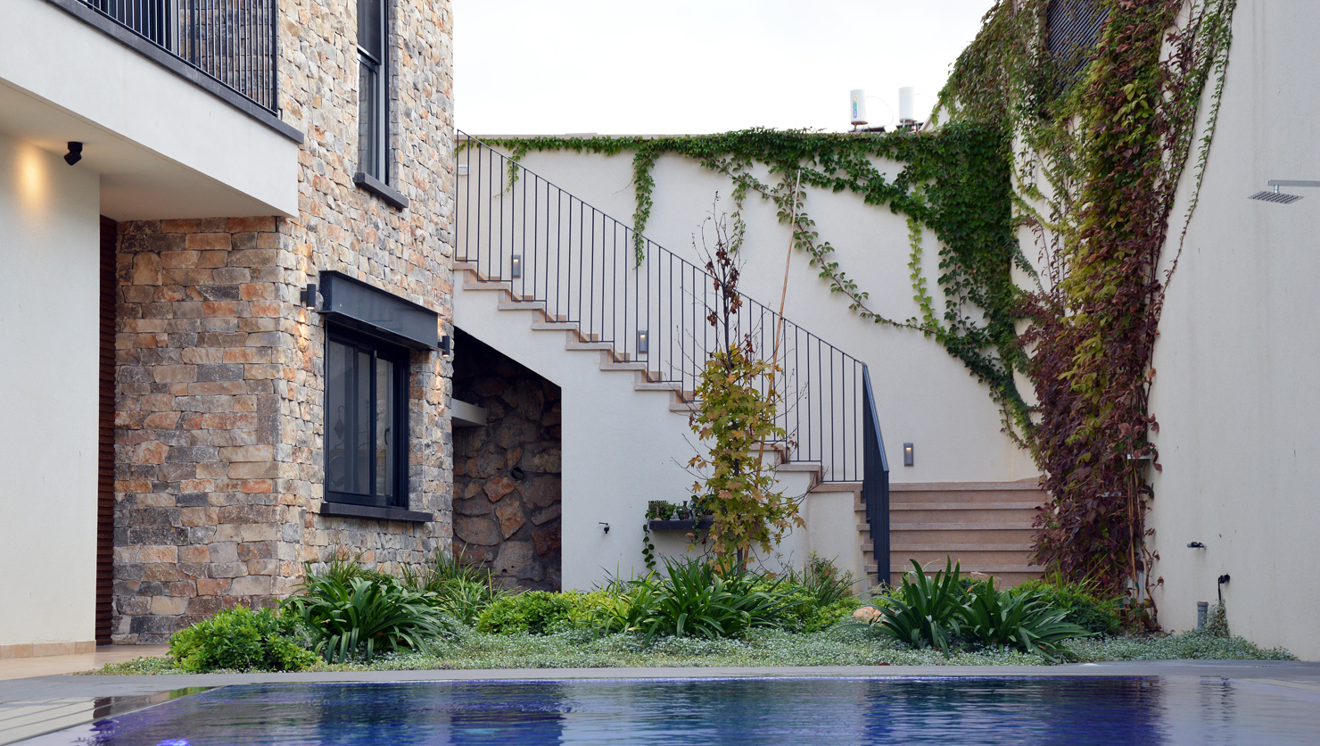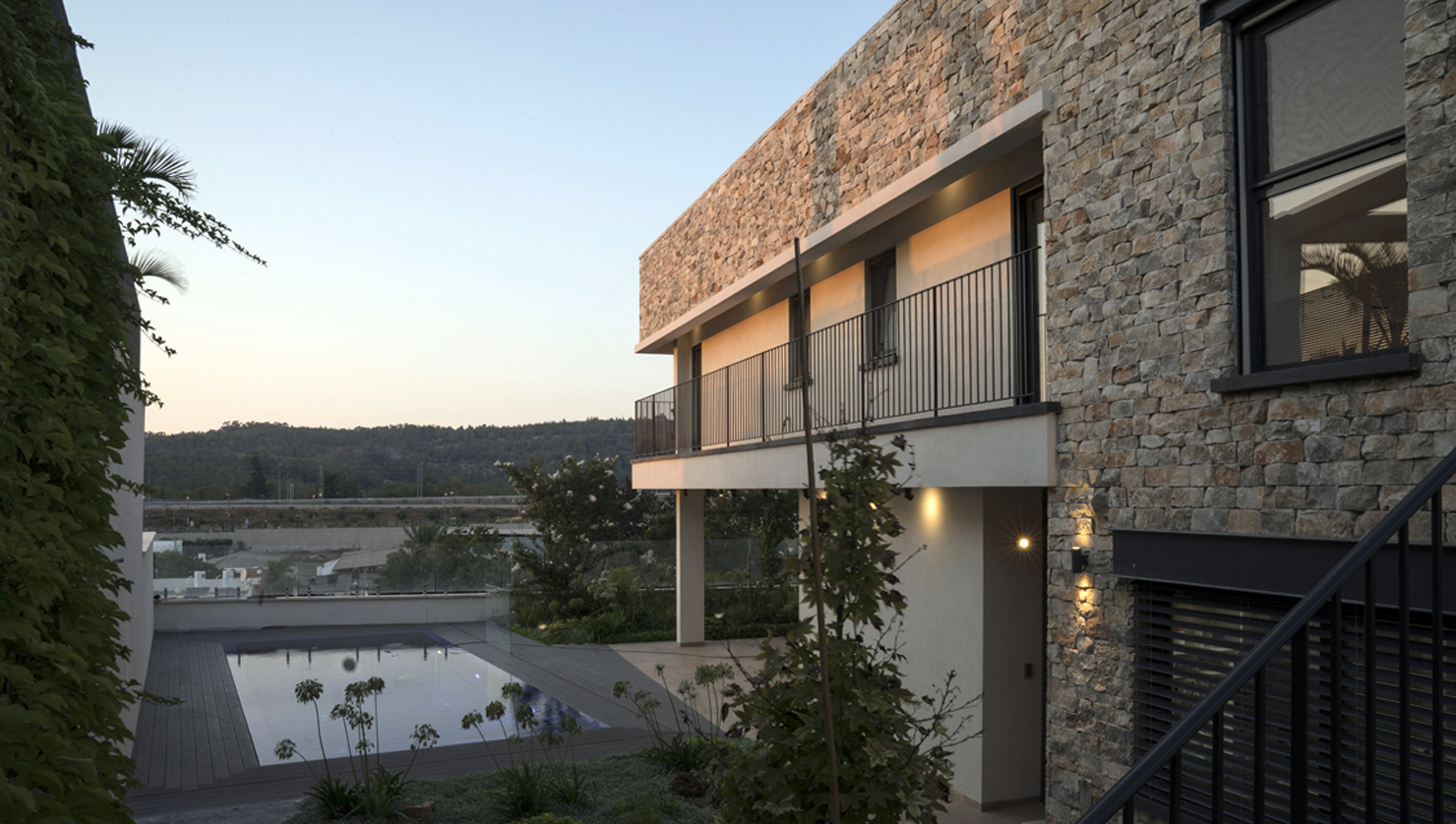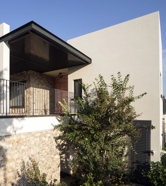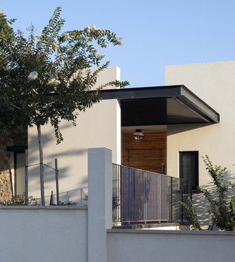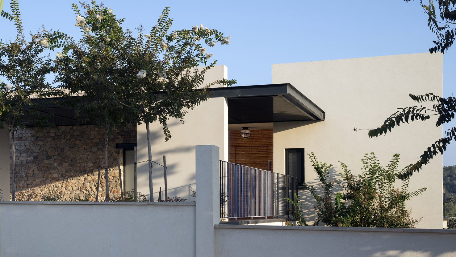 האתר התאפיין טרם הבניה בשטח תלול במיוחד. לאחר עבודות פיתוח מסיביות התקבל מישור המגרש במפלס הנמוך כקומה ממפלס הרחוב הסמוך. המרחבים הציבוריים של הבית (המטבח, פינת האוכל והאירוח/ סלון) מוקמו במפלס התחתון, מפלס החצר. הגישה למפלס זה- דרך מדרגות פיתוח מאזור הכניסה למתחם החצר מהרחוב. במפלס זה ממוקמת יחידת דיור נוספת המרוחקת במעט מהיחידה העיקרית ובתווך- חצר כלואה/ פטיו דרכו ניתן לעבור בין השטחים הפתוחים בהיקף הבית. בימי הקיץ החמים מתאווררת חצר הפטיו בזכות רוחות מערביות החודרות לחצר בעוצמה מוגברת בשל המפתח הצר מצפון מערב וזווית הקירות בסמוך למפתח (ראה איור ). קומת חדרי השינה ממוקמת במפלס העליון/ מפלס הרחוב ו"רוכבת" על שני חלקי הבניין התחתונים: המרחב הציבורי ויחידת הדיור. הבית מתאפיין בחללים קטנים יחסית ומוגדרים המפוזרים במרחב סביב החצר המרכזית תוך כדי טשטוש הגבולות בין פנים לחוץ. מרחב הבית לא נמדד בגודל החללים הבנויים והסגורים אלא בחיבור בין הבנויים לפתוחים בתוך החצר הפנימית והמעברים. חיפוי הבית- אבן גלילית מסותתת לצד טיח באופן היוצר איזון והשלמה בין שני החומרים. הגינה – מתאפיינת בצמחייה ארץ ישראלית ויצרת המשכיות והתמזגות עם הנוף הסובב את הבית.