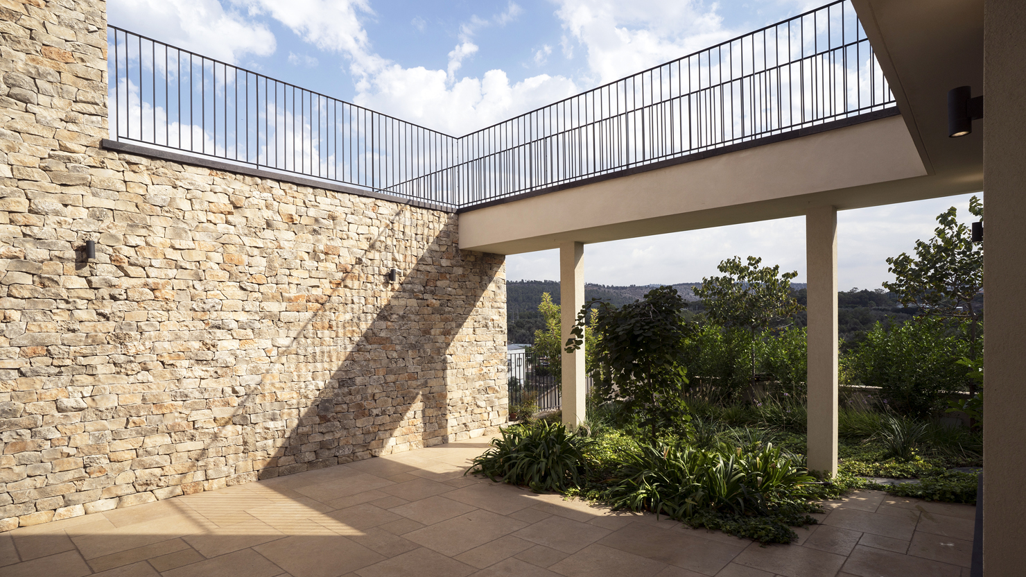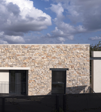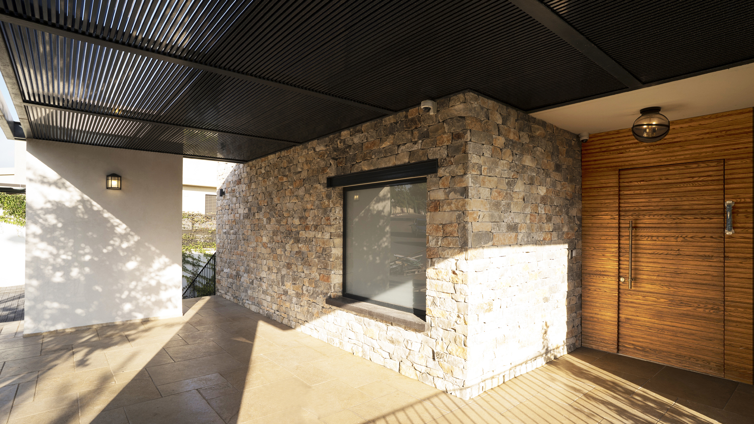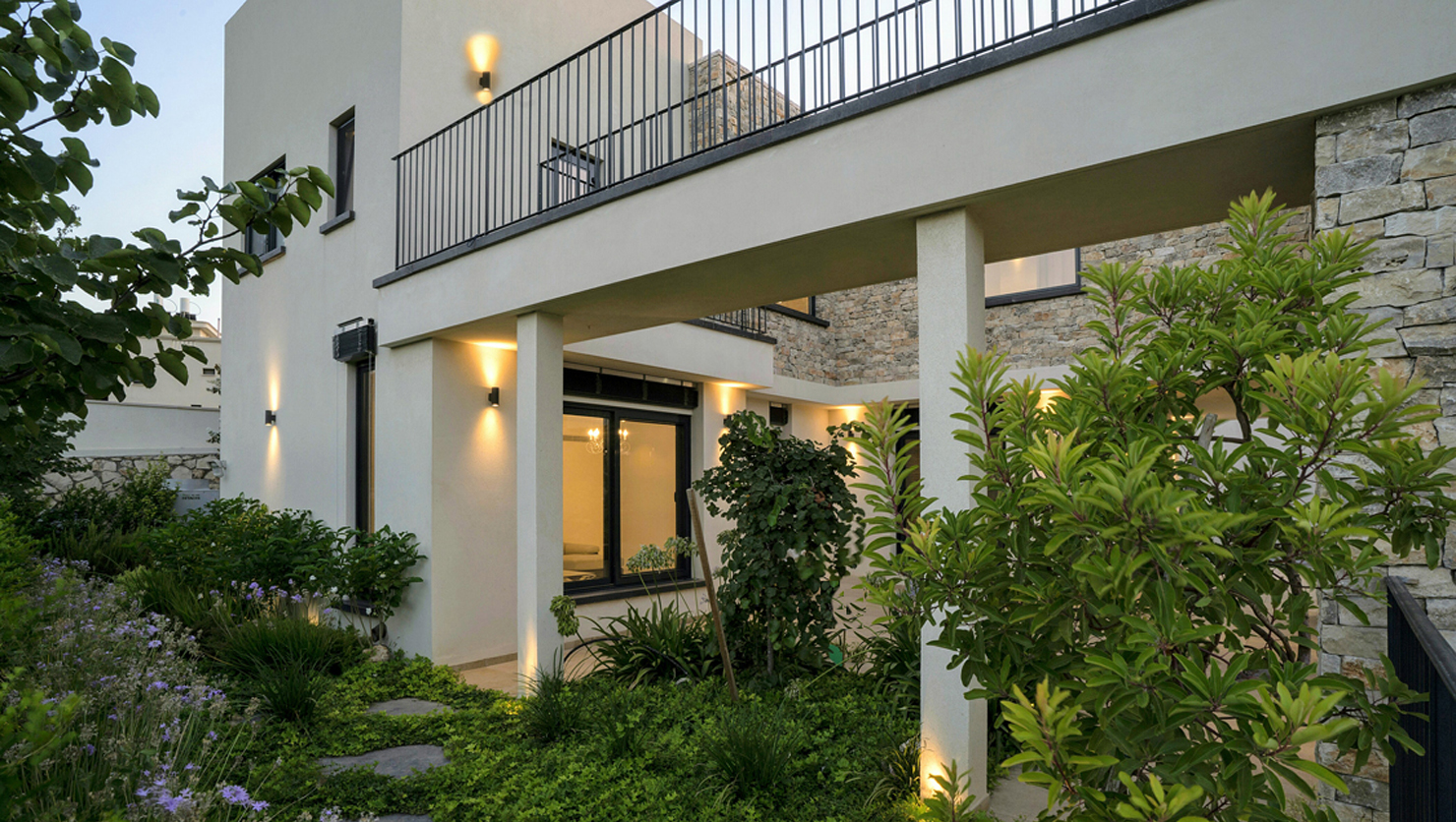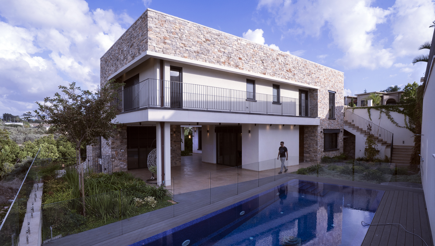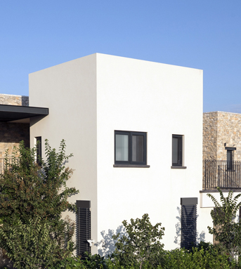 האתר התאפיין טרם הבניה בשטח תלול במיוחד. לאחר עבודות פיתוח מסיביות התקבל מישור המגרש במפלס הנמוך כקומה ממפלס הרחוב הסמוך. המרחבים הציבוריים של הבית (המטבח, פינת האוכל והאירוח/ סלון) מוקמו במפלס התחתון, מפלס החצר. הגישה למפלס זה- דרך מדרגות פיתוח מאזור הכניסה למתחם החצר מהרחוב. במפלס זה ממוקמת יחידת דיור נוספת המרוחקת במעט מהיחידה העיקרית ובתווך- חצר כלואה/ פטיו דרכו ניתן לעבור בין השטחים הפתוחים בהיקף הבית. בימי הקיץ החמים מתאווררת חצר הפטיו בזכות רוחות מערביות החודרות לחצר בעוצמה מוגברת בשל המפתח הצר מצפון מערב וזווית הקירות בסמוך למפתח (ראה איור ). קומת חדרי השינה ממוקמת במפלס העליון/ מפלס הרחוב ו"רוכבת" על שני חלקי הבניין התחתונים: המרחב הציבורי ויחידת הדיור. הבית מתאפיין בחללים קטנים יחסית ומוגדרים המפוזרים במרחב סביב החצר המרכזית תוך כדי טשטוש הגבולות בין פנים לחוץ. מרחב הבית לא נמדד בגודל החללים הבנויים והסגורים אלא בחיבור בין הבנויים לפתוחים בתוך החצר הפנימית והמעברים. חיפוי הבית- אבן גלילית מסותתת לצד טיח באופן היוצר איזון והשלמה בין שני החומרים. הגינה – מתאפיינת בצמחייה ארץ ישראלית ויצרת המשכיות והתמזגות עם הנוף הסובב את הבית.