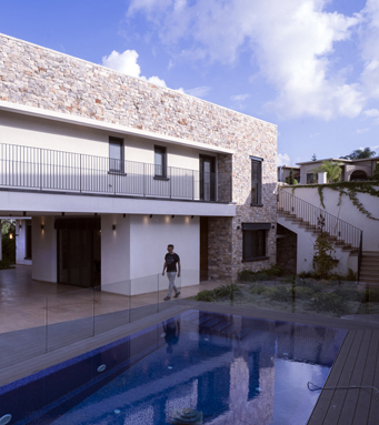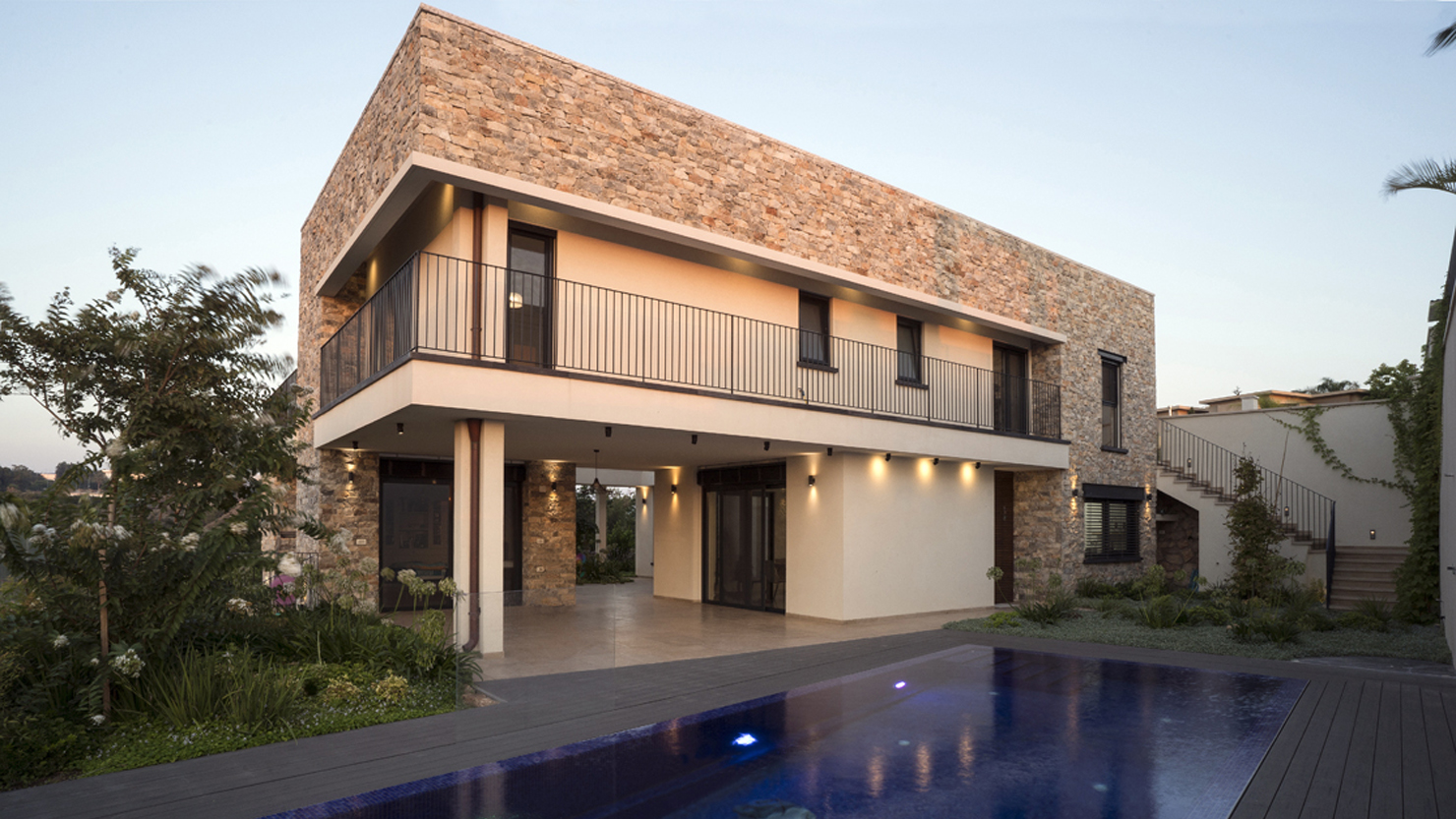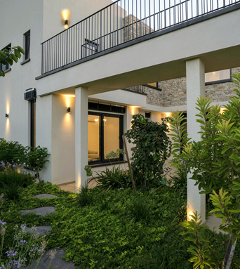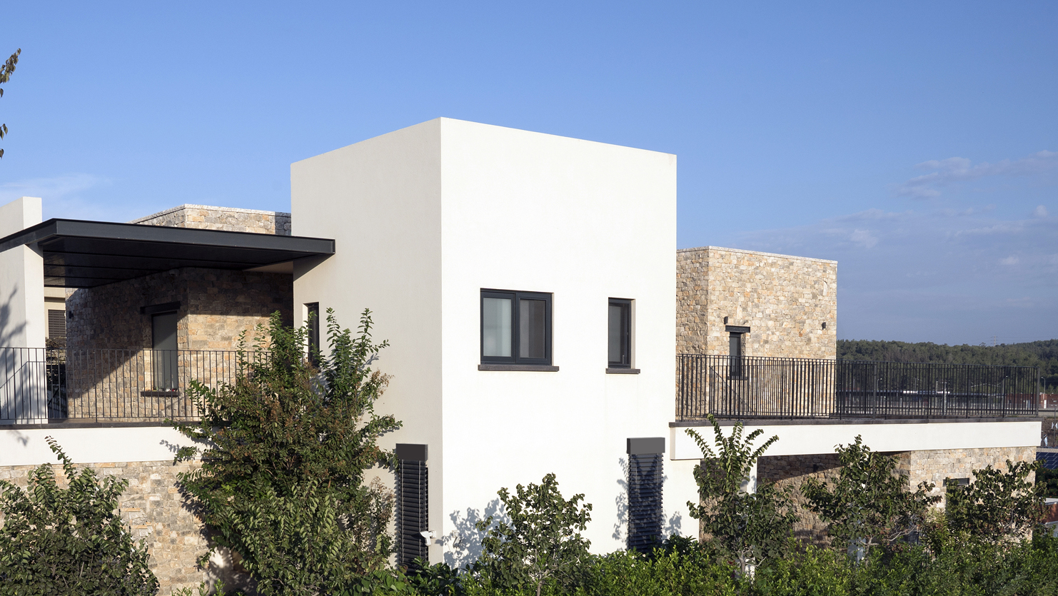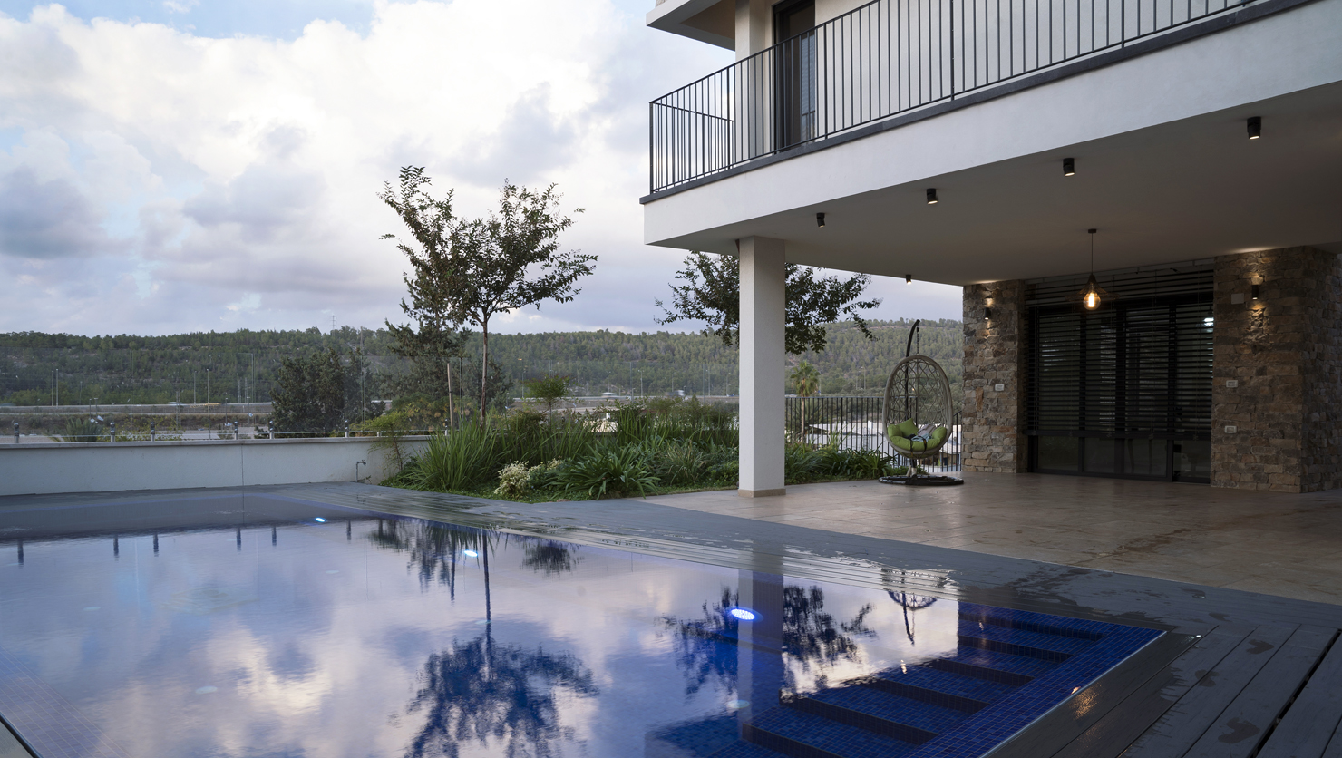 האתר התאפיין טרם הבניה בשטח תלול במיוחד. לאחר עבודות פיתוח מסיביות התקבל מישור המגרש במפלס הנמוך כקומה ממפלס הרחוב הסמוך. המרחבים הציבוריים של הבית (המטבח, פינת האוכל והאירוח/ סלון) מוקמו במפלס התחתון, מפלס החצר. הגישה למפלס זה- דרך מדרגות פיתוח מאזור הכניסה למתחם החצר מהרחוב. במפלס זה ממוקמת יחידת דיור נוספת המרוחקת במעט מהיחידה העיקרית ובתווך- חצר כלואה/ פטיו דרכו ניתן לעבור בין השטחים הפתוחים בהיקף הבית. בימי הקיץ החמים מתאווררת חצר הפטיו בזכות רוחות מערביות החודרות לחצר בעוצמה מוגברת בשל המפתח הצר מצפון מערב וזווית הקירות בסמוך למפתח (ראה איור ). קומת חדרי השינה ממוקמת במפלס העליון/ מפלס הרחוב ו"רוכבת" על שני חלקי הבניין התחתונים: המרחב הציבורי ויחידת הדיור. הבית מתאפיין בחללים קטנים יחסית ומוגדרים המפוזרים במרחב סביב החצר המרכזית תוך כדי טשטוש הגבולות בין פנים לחוץ. מרחב הבית לא נמדד בגודל החללים הבנויים והסגורים אלא בחיבור בין הבנויים לפתוחים בתוך החצר הפנימית והמעברים. חיפוי הבית- אבן גלילית מסותתת לצד טיח באופן היוצר איזון והשלמה בין שני החומרים. הגינה – מתאפיינת בצמחייה ארץ ישראלית ויצרת המשכיות והתמזגות עם הנוף הסובב את הבית.