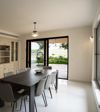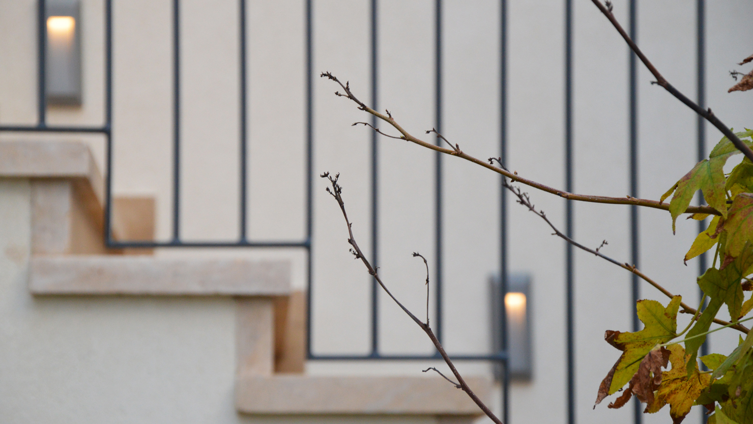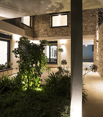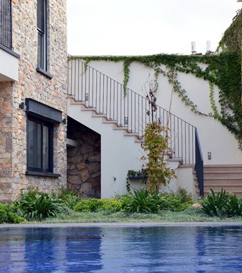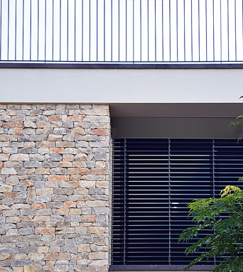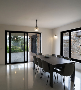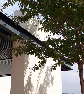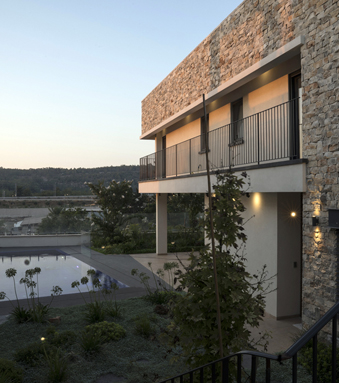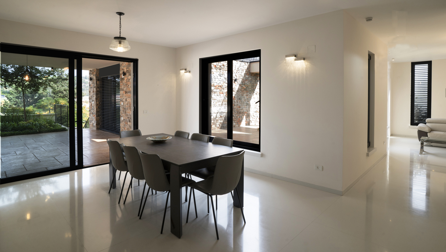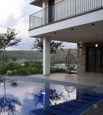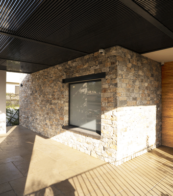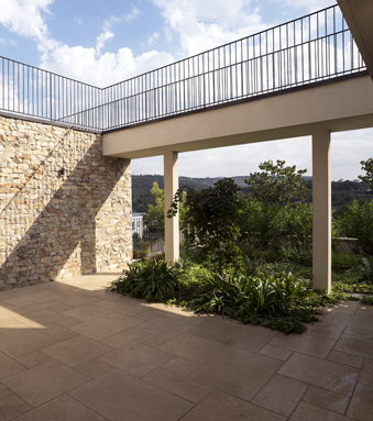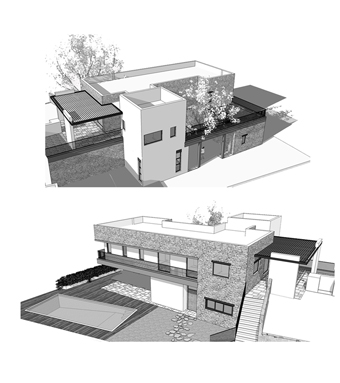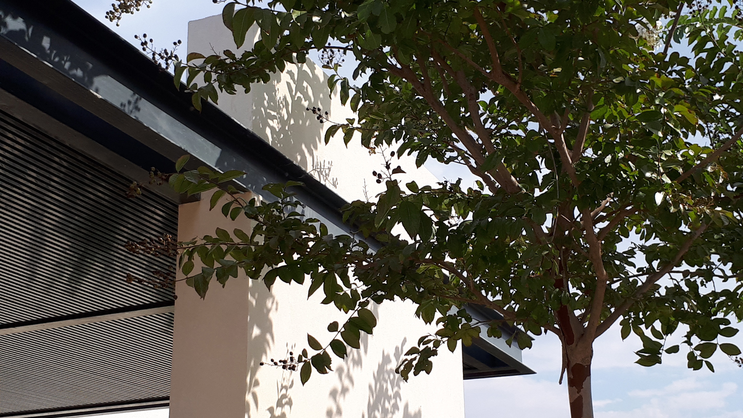 האתר התאפיין טרם הבניה בשטח תלול במיוחד. לאחר עבודות פיתוח מסיביות התקבל מישור המגרש במפלס הנמוך כקומה ממפלס הרחוב הסמוך. המרחבים הציבוריים של הבית (המטבח, פינת האוכל והאירוח/ סלון) מוקמו במפלס התחתון, מפלס החצר. הגישה למפלס זה- דרך מדרגות פיתוח מאזור הכניסה למתחם החצר מהרחוב. במפלס זה ממוקמת יחידת דיור נוספת המרוחקת במעט מהיחידה העיקרית ובתווך- חצר כלואה/ פטיו דרכו ניתן לעבור בין השטחים הפתוחים בהיקף הבית. בימי הקיץ החמים מתאווררת חצר הפטיו בזכות רוחות מערביות החודרות לחצר בעוצמה מוגברת בשל המפתח הצר מצפון מערב וזווית הקירות בסמוך למפתח (ראה איור ). קומת חדרי השינה ממוקמת במפלס העליון/ מפלס הרחוב ו"רוכבת" על שני חלקי הבניין התחתונים: המרחב הציבורי ויחידת הדיור. הבית מתאפיין בחללים קטנים יחסית ומוגדרים המפוזרים במרחב סביב החצר המרכזית תוך כדי טשטוש הגבולות בין פנים לחוץ. מרחב הבית לא נמדד בגודל החללים הבנויים והסגורים אלא בחיבור בין הבנויים לפתוחים בתוך החצר הפנימית והמעברים. חיפוי הבית- אבן גלילית מסותתת לצד טיח באופן היוצר איזון והשלמה בין שני החומרים. הגינה – מתאפיינת בצמחייה ארץ ישראלית ויצרת המשכיות והתמזגות עם הנוף הסובב את הבית.
