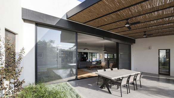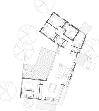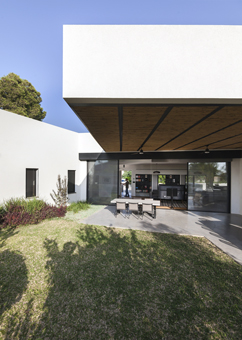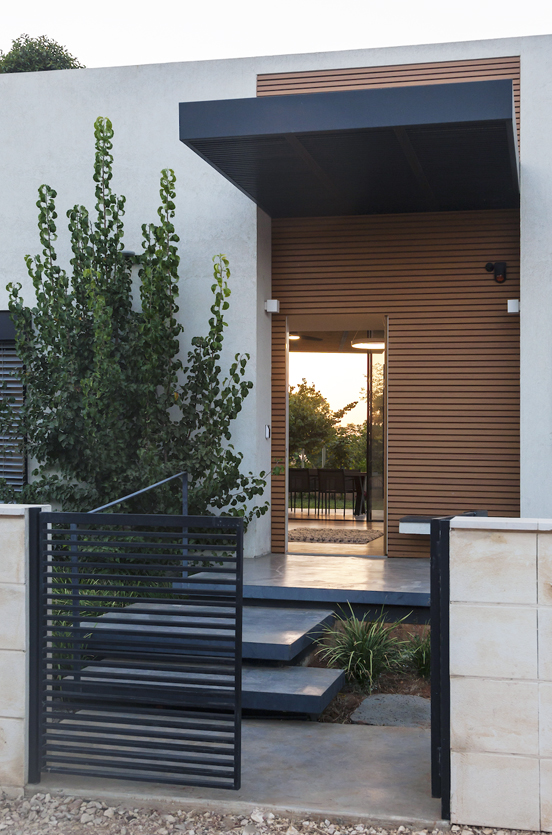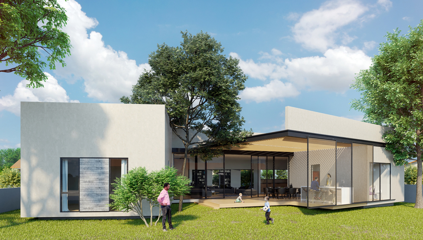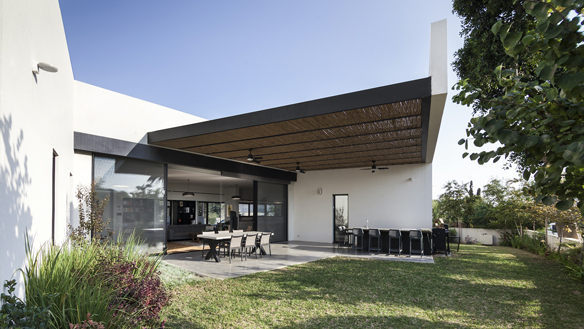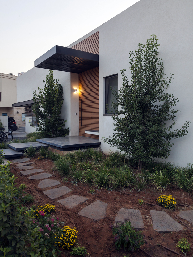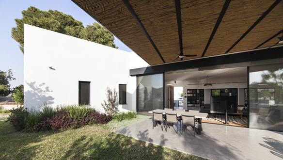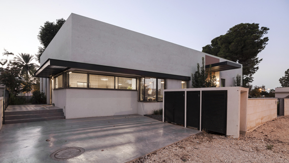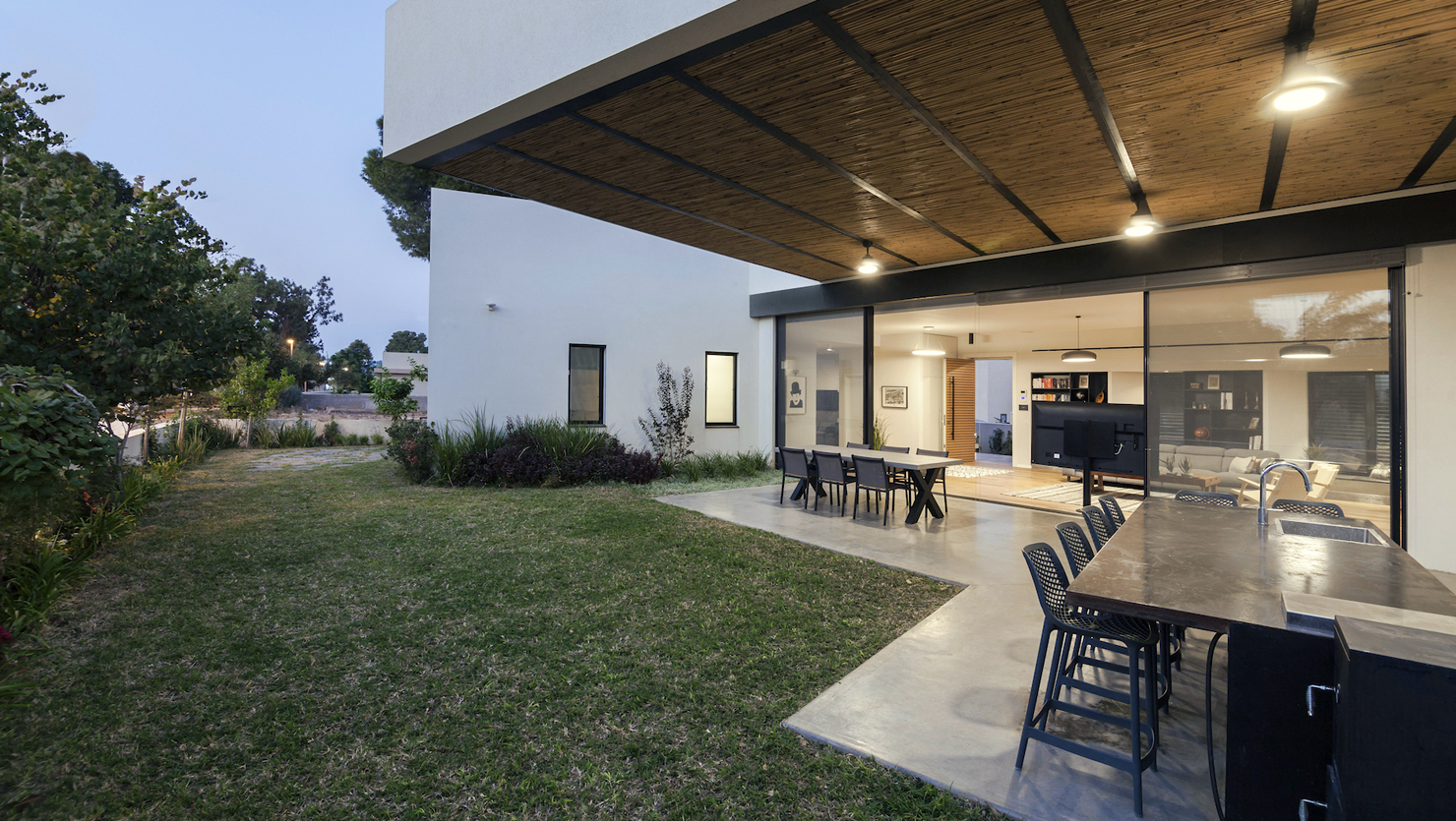 הבית, שתוכנן עבור משפחה, בנוי כסהר סביב החצר. במרכז הסהר- המרחב הציבורי ובקצותיו- חדרי המגורים.