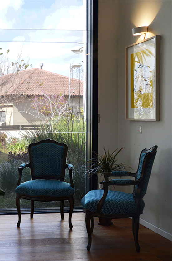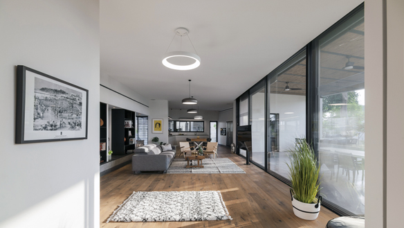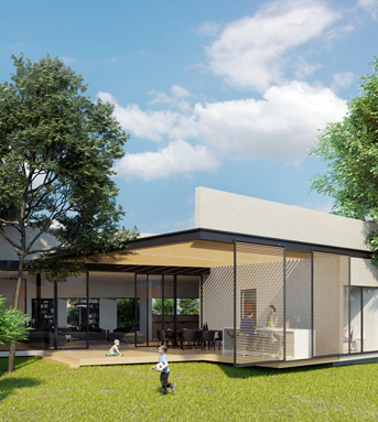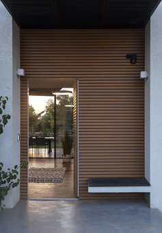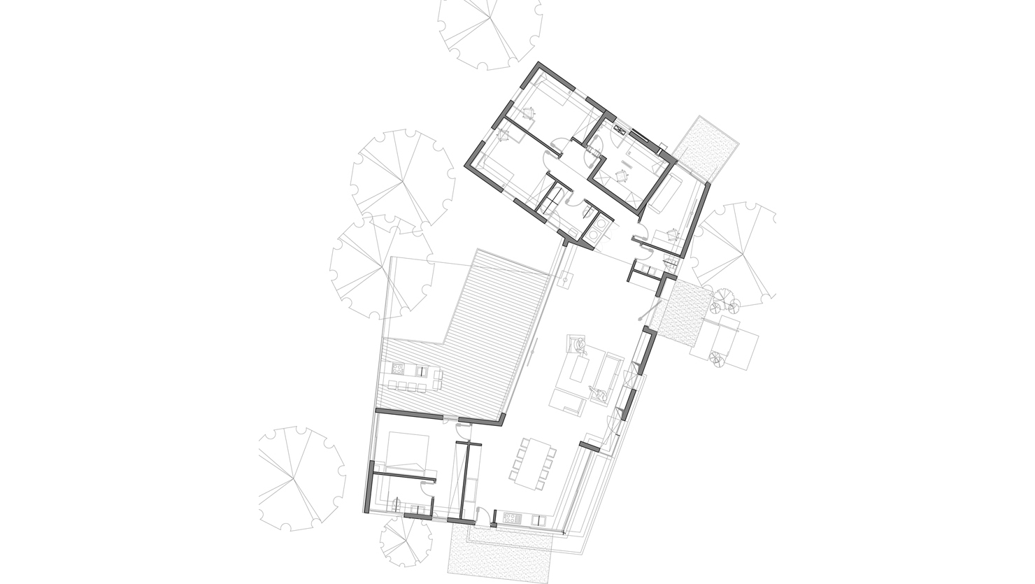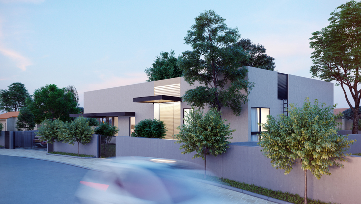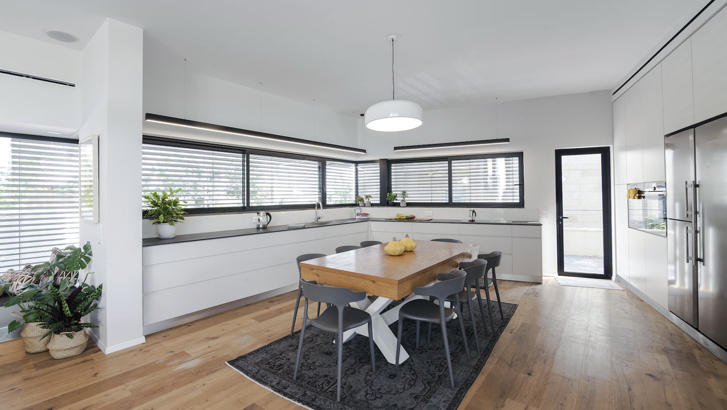 הבית, שתוכנן עבור משפחה, בנוי כסהר סביב החצר. במרכז הסהר- המרחב הציבורי ובקצותיו- חדרי המגורים.